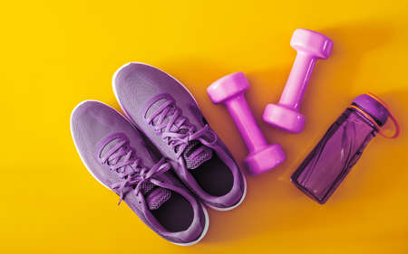 Top view of purple and violet sport shoes, dumbbells and bottle of water on yellow background. Fitness and Healthy lifestyle background concept.