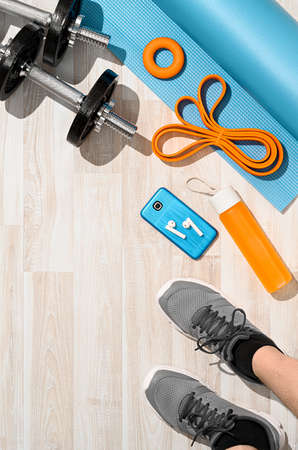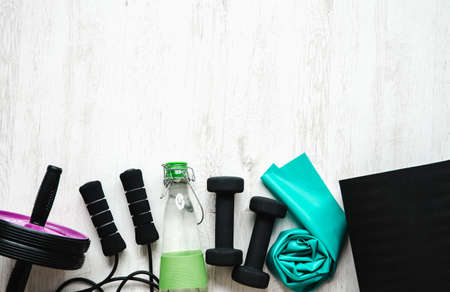 Above view of lot of home training things on home room white wood floor. Lot of copy space. Healthy fit life concept. Bottom border, lot of room for text.
