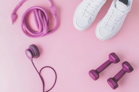 A minimalist flat lay featuring essential fitness gear: dumbbells, a yoga mat, water bottle, and towel on a muted pink surface. It promotes the concept of wellness, personal fitness, and a healthy lifestyle, capturing a moment of quiet preparation before or after a workout.