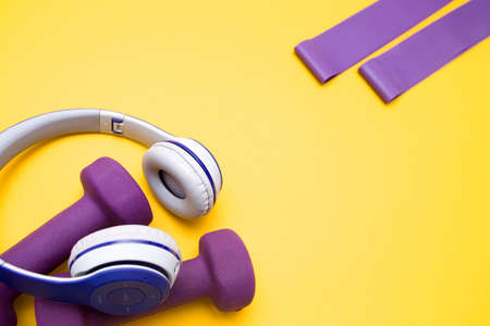 blue and gray colored wireless headphones, elastic bands of an expander and purple dumbbells covered with rubber on a yellow background, copy space, top view, home workout concept
