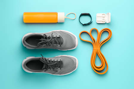 Sports background. Equipment for training and outfit on teal background: expander, fitness tracker, sneakers, bottle juice. Fitness, workout at home. Knolling flat lay composition, overhead view