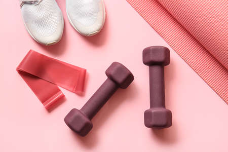 Stylish dumbbells, elastic band and shoes on pink background