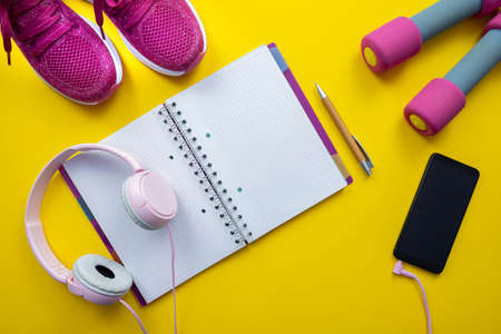 pink sneakers and dumbbells, notebook with pen and headphones with cell phone on yellow background