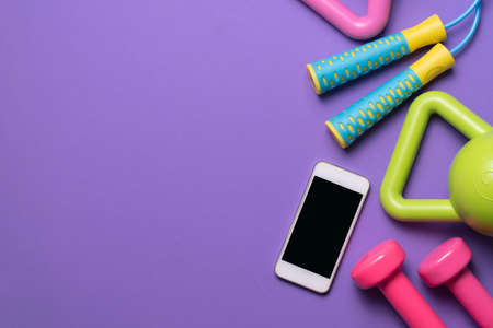 Set of sports equipment and mobile phone with earphones on color background