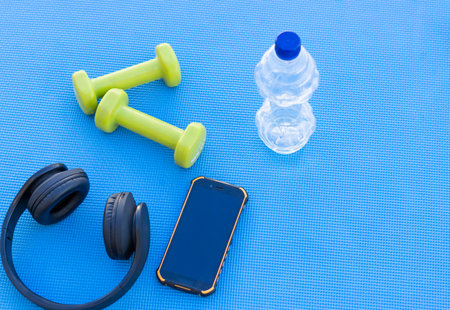 Fitness equipment. Sneakers, water, dumbbells and headphones on blue background