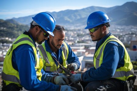 Three construction workers in safety gear demonstrate teamwork and professionalism outdoors