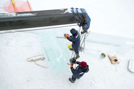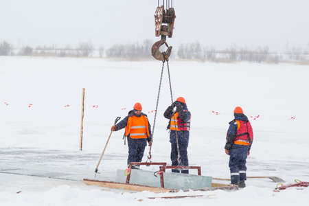 Workers observe the lifting of ice plates with a lane crane using metal frames