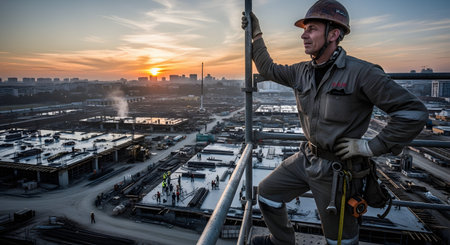 A construction worker stands on high scaffolding, surveying a large building site and city skyline at sunset. The dramatic lighting highlights the scale of the project and the role of labor in urban development.