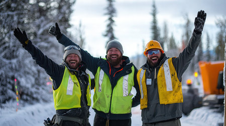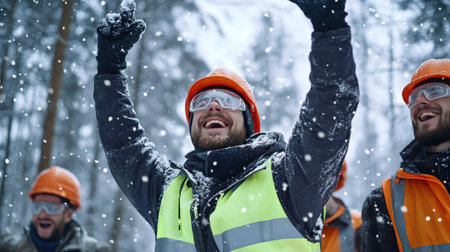 Engineers celebrating success in winter, wearing reflective vests and smiling with snowy trees behind