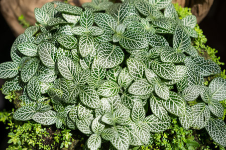 Close-up of a lush Fittonia plant with vibrant green leaves and striking white vein patterns growing in a shaded indoor garden