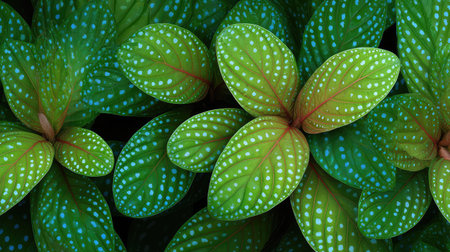 Explore the beauty of nature with this close-up of vibrant green leaves featuring stunning blue dots. Perfect for highlighting lush, tropical themes and organic designs.