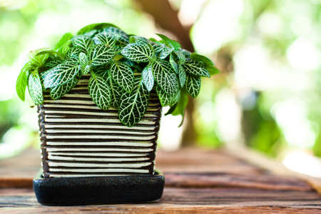 Top view of fittonia plant in pot on wooden table