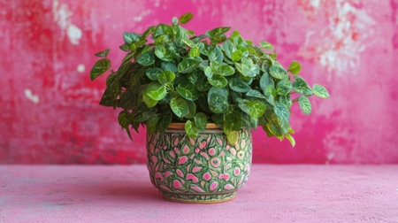 A lush green plant sits in a beautifully patterned pot against a bright pink backdrop. This image showcases natural beauty and vibrant decor for any space.
