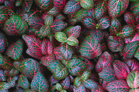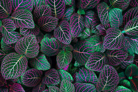 Neon purple with dark emerald green color fittonia albivenis plants. Tropical houseplant top view. Colorful leaf texture, for background.