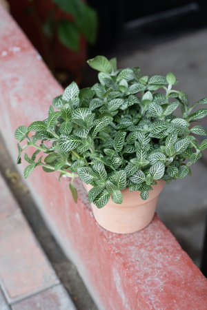 Fittonia in a ceramic pot on the red step