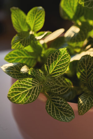 Striking fittonia nerve plant leaves showcasing detailed green foliage and prominent pink vein patterns in a close up view. this tropical houseplant is popular for its vibrant texture and color, symbolizing growth and natural beauty.