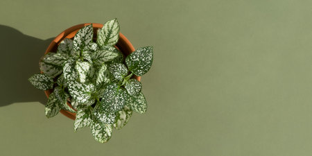 Home plant fittonia in a clay pot on a green background. The concept of minimalism. Houseplants in a modern interior. top view. Banner.