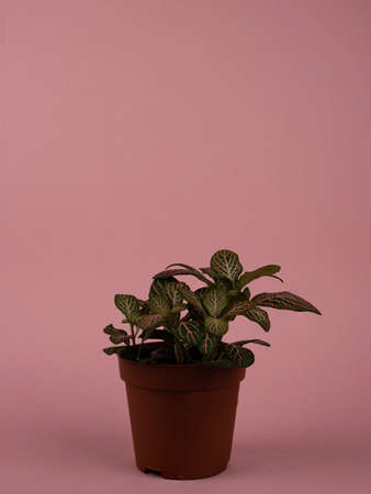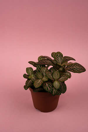 Fittonia albivenis in flowerpot on pink background