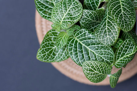 fittonia albivenis Green leaves in a pot on a gray background, top view.