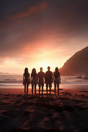 A trio of friends stands atop a rugged cliff, basking in the warm glow of a sunset over the ocean, a moment that captures the essence of wanderlust and friendship.. AI Generation