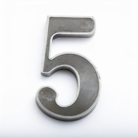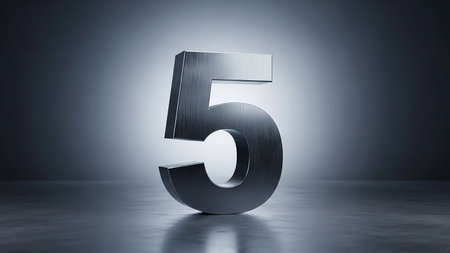 A three-dimensional brushed metal number five stands centered, illuminated by dramatic lighting against a dark, reflective surface.