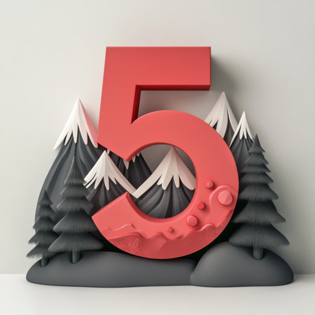 Winter Forest Landscape with Red Number 5 and Snowcapped Mountains - Design for Print, Card, Poster
