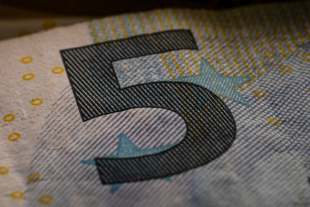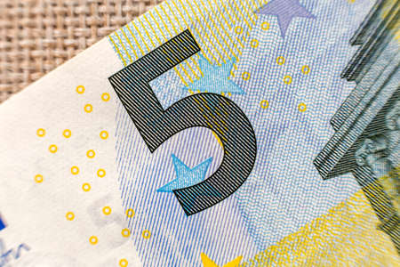 Selective focus on detail of euro banknotes. Close up macro detail of money banknotes, 5 euro isolated. World money concept, inflation and economy concept