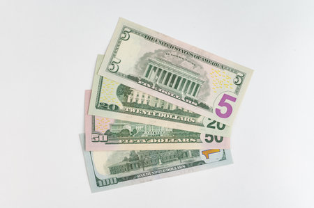 Fifty dollar bills laying on a white background - money, finance imagery