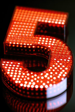 Glowing red led number five on black background with bokeh effect.