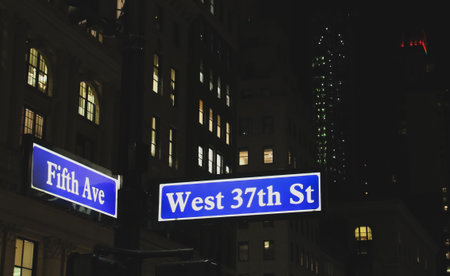 Night cityscape of New York, USA. Sign indicating the intersection of 5th Ave. with West 37th St illuminated at night.
