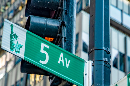 Fifth avenue 5 ave road sign, Manhattan midtown architecture, New York City 5th av street corner. Green traffic crossroad signage, USA. Window of yellow building.