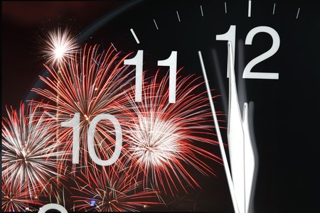 clock at midnight and fireworks New Year's eve celebration