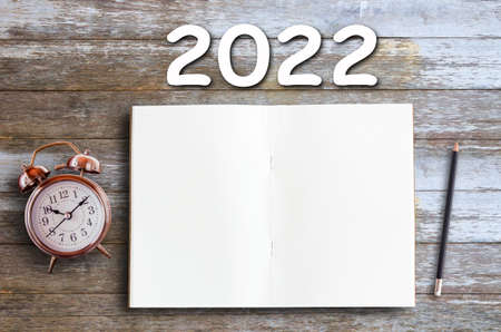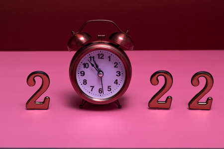 Numbers 2022 on wooden planks, black retro alarm clock and Christmas decorations on a dark background.