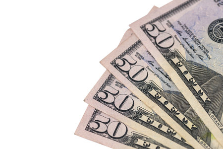 50 US dollar bills laid out on a white background. Isolated image of a top view.