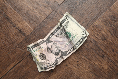 Old 5 dollar bill on a wooden table. Close up. The concept of saving money