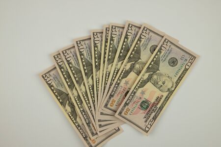 many banknotes of 20 dollars bills background. Money currecy profit business concept.