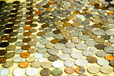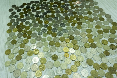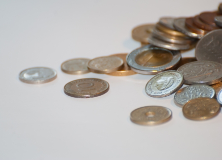 Various coins piled up on the desk