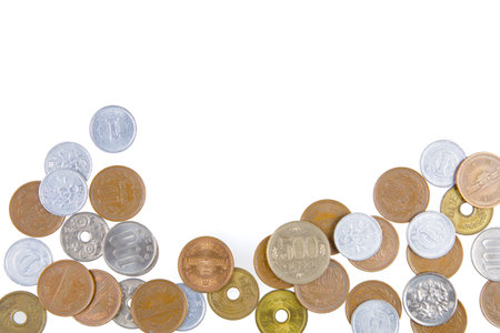 A Flat Lay background of Japanese Coins isolated on a white background with copy space.