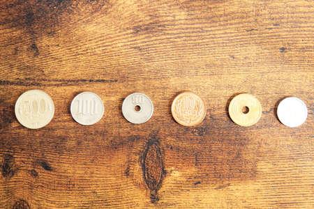 Japanese 100-yen coins on a wooden desk