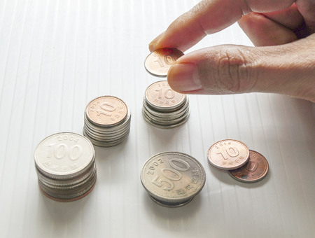 Female hand putting korean coins into columns. Business and money saving concept.