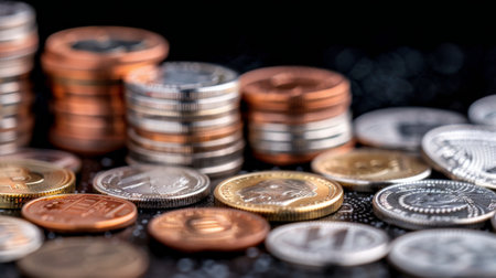 Various coins are stacked atop each other on a shiny surface, with a warm bokeh background adding depth and richness to the scene.