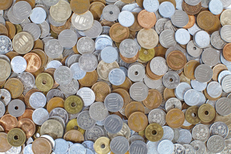 View a lot of 100-yen coins on the desk from directly above