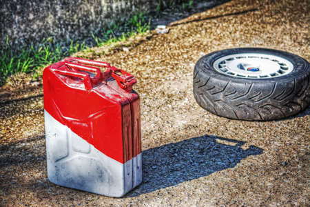 fuel tank and car wheel on the ground in hdr