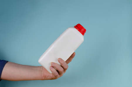 Hand holds white container with lid for liquids on blue background. Rectangular plastic generic bottle with red lid. Side view.
