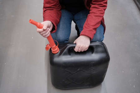 Refilling canister with fuel on the petrol station. Close up view. Fuel, gasoline, diesel is getting more expensive. Petrol industry and service. Petrol price and oil crisis concept.