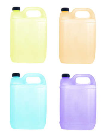 Plastic bottles of laundry detergent or bleach for washing dishes.