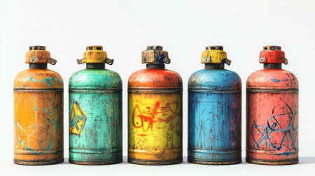 A collection of vintage spray paint cans in various vibrant colors, showcasing unique graffiti markings against a plain white background, ideal for art projects.