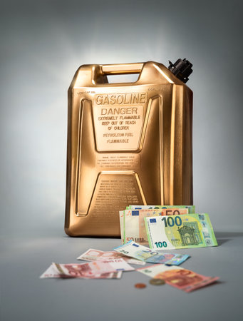 Gold can of gasoline with stacks of large billed Euro banknotes on gray background