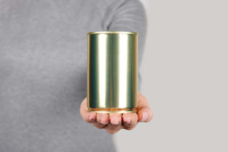 Hand with metal can, preserve tin on grey