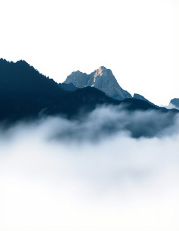 A stunning view of a solitary mountain peak enveloped in mist and fog. The serene landscape embodies tranquility, making it perfect for nature enthusiasts and wanderers.